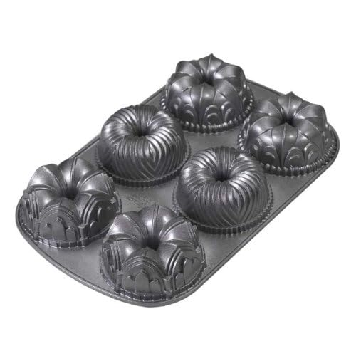 The Garland pan has mini versions of our popular Cathedral, Fleur de lis, and Bavaria Bundt shapes. Six 3/4 cup cavities 4" x 2". Nordic Ware's original cast aluminum bakeware provides fine details and superior baking performance. The heat reflective exteriors allow for uniform browning so as to enhance our unique designs. Nonstick cast aluminum allows for easy clean up. Great for Ice Cream Cakes, Jell-O Mold. Ten year limited warranty. Proudly made in the USA by Nordic Ware.